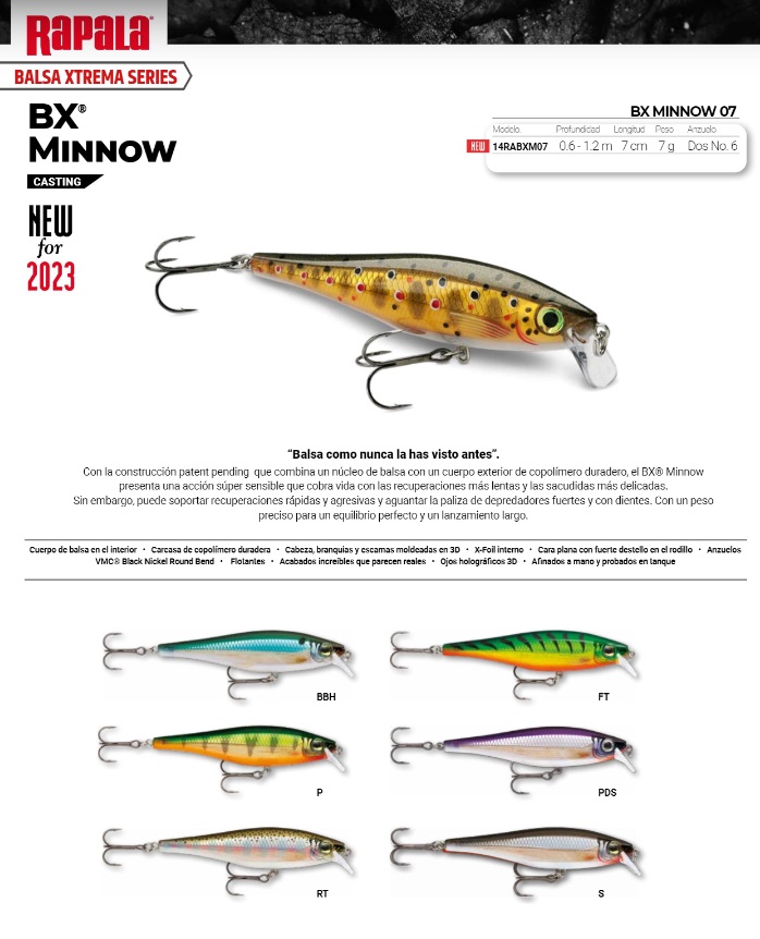 Con la construccion pendiente de patente que combina un nucleo interior de balsa con un cuerpo de copolymero duradero, el BX MINNOW presenta una accion super sensible que cobra vida con las recuperaciones mas lentas y sacudidas suaves, sin embargo, puede soportar recuperaciones agresivas y rapidas.