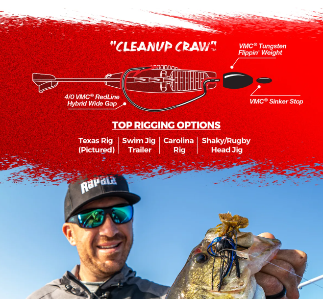 Diseñado en colaboración entre Rapala y el profesional de pesca de la Major League, Jacob Wheeler, el Rapala Crush City Cleanup Craw fue diseñado para ser el cebo de ensueño de Jacob. El Rapala Crush City Cleanup Craw, con el tamaño, la forma y la acción perfectos para generar mordiscos y ganar torneos, presenta dos grandes garras con bridas agresivas que producen una acción de patada apretada. El diseño muy acanalado también ayuda a mover una tonelada de agua y oculta los puntos de los ganchos para facilitar el montaje sin malas hierbas.